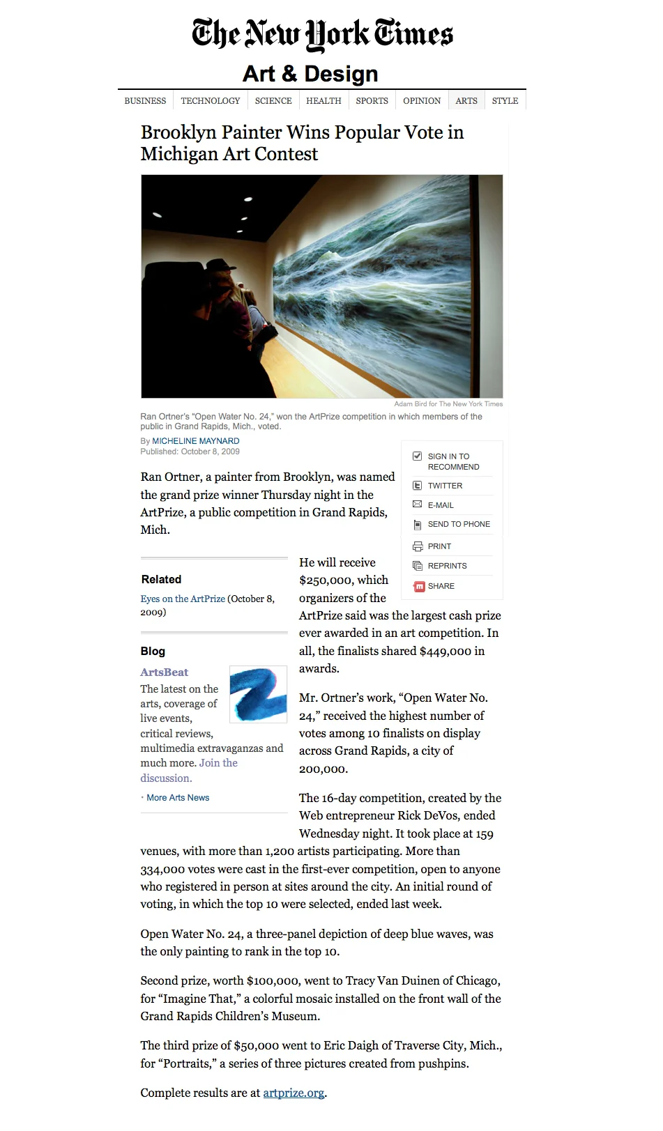 "Brooklyn Artist Ran Ortner rides wave of acclaim for Open Water No. 24 to first place in Art Prize", NY Daily News, October 9, 2009